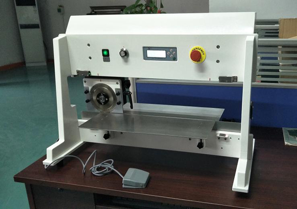 將要進行分切的V-CUT連板的V形槽對準下切刀的刀刃口,然后腳踩腳踏閥,圓形刀片左右移動,從而將V-CUT連板分離。