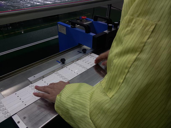 根據連板尺寸調節定位導軌,將要進行分切的V-CUT聯板的對準放板導軌,然后手推入刀口,滾刀自動帶走V-CUT連板帶走并分切,從而將多聯板V-CUT線路板分離。